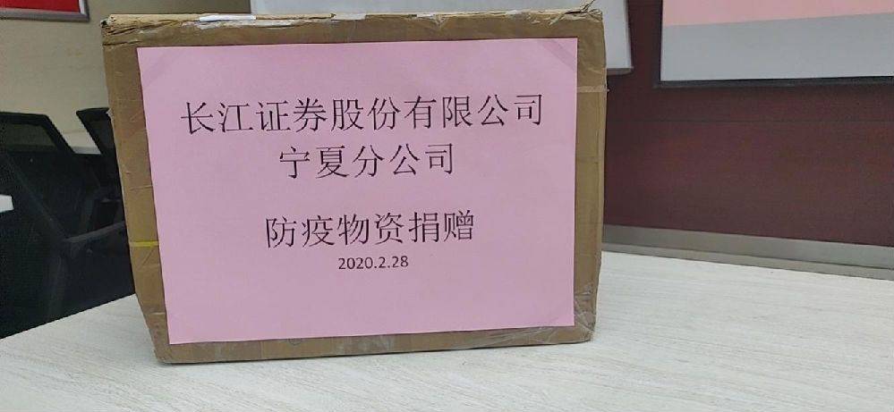 疫情就是命令,防控就是责任。在全民防控新冠肺炎疫情的关键时刻,长江证券股份有限公司宁夏分公司(以下简称“分公司”)积极履行社会责任,于2月28日向宁夏中卫市海原县应急管理局捐赠500只医用口罩,助力战“疫”,用于疫情防控一线。