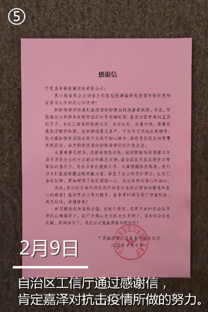 吴忠市政府对嘉泽的捐赠予以高度评价并表示感谢,指出嘉泽能够想政府所想,急政府所急,切切实实为抗击疫情贡献力量,肩负起了企业的社会责任和担当,嘉泽的善举值得肯定和学习。吴忠市政府也在第一时间将嘉泽捐赠的防护服送往抗疫一线。
