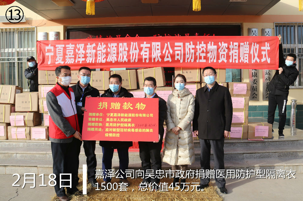 鼠年伊始,新型冠状病毒感染的肺炎疫情肆虐全国,面对严峻的形势,宁夏嘉泽新能源股份有限公司董事长陈波始终关注着抗击疫情进展,心系一线医护人员,更时刻关心着全体嘉泽人的平安健康。疫情发生后,陈波董事长亲自部署公司的防疫工作,并以个人名义向湖北省捐赠善款,支援武汉防疫一线。同时,宁夏嘉泽集团有限公司向红寺堡区捐赠善款10万元。