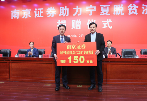 捐赠仪式上,江念南代表南京证券向自治区总工会“工会班”捐赠专项助学资金、向吴忠市同心县捐赠畜牧养殖基地援建资金、向灵武市东塔乡捐赠集体经济发展支持资金,毛洪峰、丁炜、魏富分别代表自治区总工会、同心县、灵武市接受捐赠。