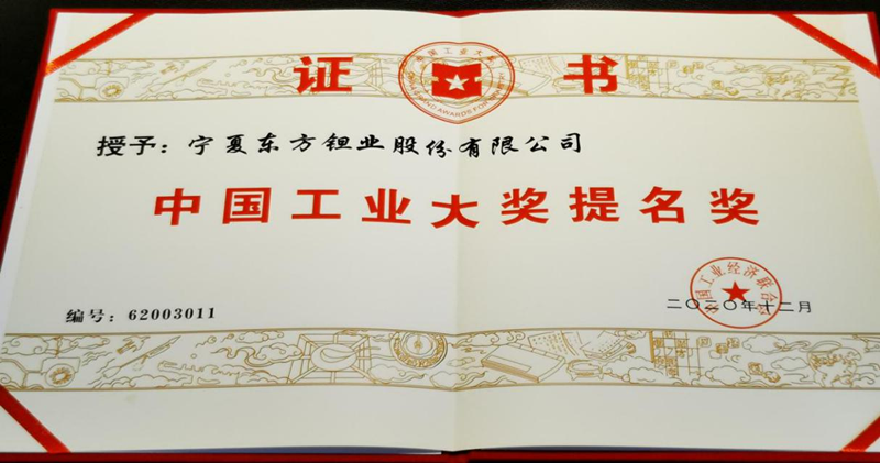 2020年12月27日,第六届中国工业大奖发布会及颁奖仪式在北京举行。宁夏东方钽业股份有限公司(以下简称:东方钽业)荣获“中国工业大奖提名奖”。