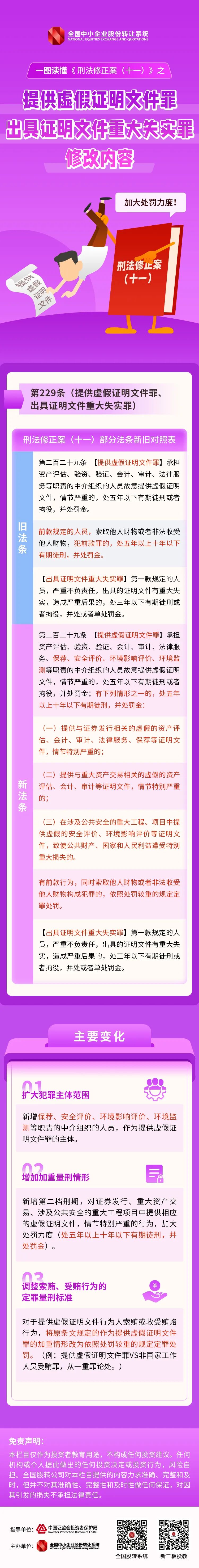 2021年3月1日起,《中华人民共和国刑法修正案(十一)》(以下简称《刑法修正案(十一)》)正式施行?!缎谭ㄐ拚福ㄊ唬范陨婕白时臼谐〉钠壅┓⑿?、信息披露违法、操纵市场、提供虚假证明文件等犯罪行为的罪名适用对象、犯罪行为的表现、刑事处罚标准等方面进行了更加明确的规定。为贯彻证监会关于加强《刑法修正案(十一)》学习宣传的工作要求,全国股转公司制作了一图读懂《刑法修正案(十一)》系列学习材料,欢迎广大投资者参考、学习。