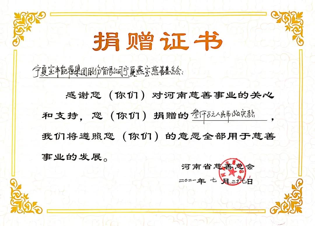 “一方有难,八方支援”。连日来,河南省郑州多地遭遇强降雨天气致灾,造成重大人员伤亡和财产损失,举国上下为之牵挂。天灾无情人有情,宁夏宝丰能源集团携燕宝慈善基金会坚决贯彻落实习近平总书记重要指示精神,在自治区党委政府领导下,践行企业社会责任,7月27日,通过河南省慈善总会捐赠3000万元救灾款驰援河南,善款将全部用于河南受灾严重地区的灾后重建工作。