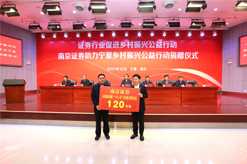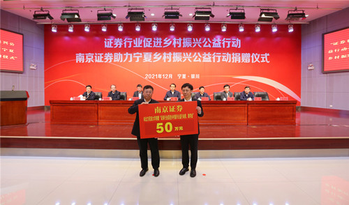 为深入贯彻落实党中央、国务院关于巩固拓展脱贫攻坚成果,全面推进乡村振兴的决策部署,响应中国证监会、中国证券业协会号召,12月17日,南京证券在银川举行“证券行业促进乡村振兴公益行动——南京证券助力宁夏乡村振兴公益行动”捐赠仪式,向宁夏回族自治区总工会、国家乡村振兴重点帮扶县同心县和海原县、北方民族大学合计捐赠420万元助力乡村振兴帮扶资金。