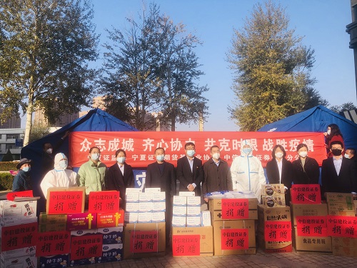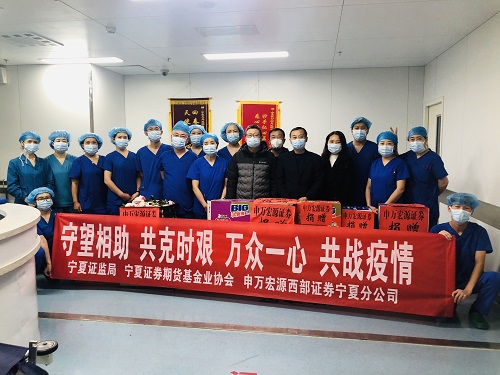 自新一轮新冠肺炎疫情发生以来,宁夏医科大学总医院急诊手术室医护人员连续奋战10多个日夜,不离岗、不回家,坚守在一线,为人民群众生命安全与健康筑起了一道坚固防线。为助力抗疫,表达敬意,申万宏源西部证券宁夏分公司联合宁夏证监局、宁夏证券期货基金业协会深入宁夏医科大学总医院急诊大楼,捐赠防疫物资及生活用品,向坚守岗位的白衣天使送去温暖和关怀;作为宁夏唯一区域性股权市场运营机构及宁夏区域性股权市场公共服务平台,宁夏股权托管交易中心联合自治区工信厅创业和融资服务处党支部慰问银川市兴庆区健康社区一线抗疫工作人员,捐赠急需抗疫保障物资及食品,同时在疫情期间不忘做好专业综合金融服务,组织开展了一系列高质量线上公益直播课及宁企慧听微信课堂系列培训课程,持续传播最专业的资本市场声音;中信建投证券宁夏分公司向银川市兴庆区解放西街街道等抗疫一线捐赠价值3万的防疫物资及生活物资,助力防疫防控工作;安信证券银川尹家渠北街营业部深入上海西路街道办,向坚守抗疫最前沿的社区工作人员和志愿者捐赠价值2万元的防疫物品和生活物资;南京证券宁夏分公司动员辖区15家证券营业部在银川、石嘴山、吴忠、中卫、固原等五市向防疫部门及社会等捐赠抗疫物资和生活物资,用实际行动表达对防疫工作的支持和对一线工作人员的关爱。