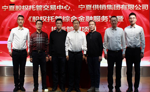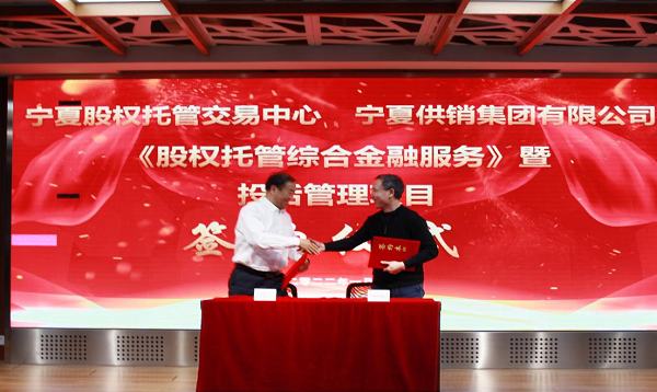 为贯彻宁夏回族自治区供销合作社联合社(以下简称“自治区供销社”)为农服务的宗旨,推动全区供销社系统内企业规范发展和经营能力提升,强化宁夏供销集团有限公司(以下简称“宁夏供销集团”)对控股、参股等涉农企业的管理效果,在自治区供销社大力支持下,宁夏供销集团与宁夏股权托管交易中心(以下简称“宁夏股交中心”)于1月14日成功举行“股权托管综合金融服务暨投后管理项目”签约仪式,充分运用宁夏股交中心市场功能和综合金融服务优势,将宁夏供销集团被投企业的投后管理落到实处,促进企业规范发展。宁夏供销集团董事长陈鹍、总经理康伏云、总经理助理范辉,宁夏股交中心董事长兼总经理金国斌、副总经理曲堃出席了签约仪式,双方业务部门人员参加本次活动。