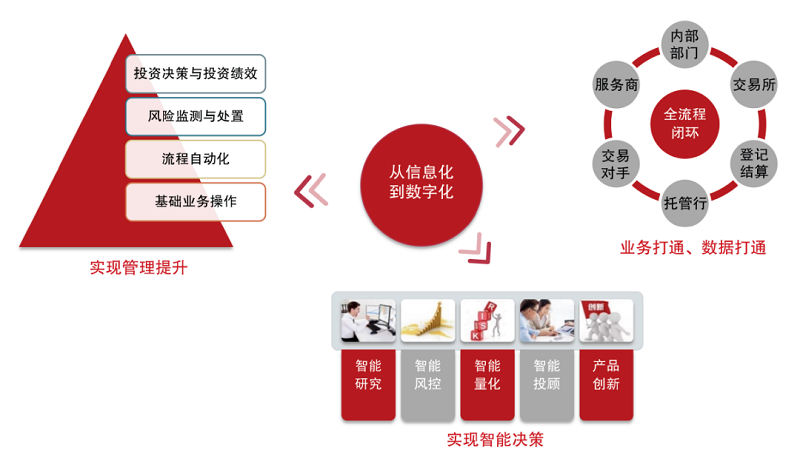 一是显著提升投研业务的效能。借助平台,实现了智能化研究、投研一体化管理、组合精细化管理、投资决策支持、智能量化投资、运营自动化、全面风险管理,极大提升了业务效能。以银行间回购业务为例,这个业务每年交易额超过10万亿,从具体的头寸管理、交易执行等指标看,数字化重构了业务模式,通过智能化和自动化,多个环节的效率有5-10倍的提升。这只是一个业务点。从整个投研业务看,按人均效率提升30%计算,每年效率提升带来的效益就超过上亿元。