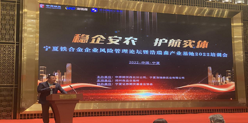 2022年9月15日下午,“稳企安农 护航实体”宁夏铁合金企业风险管理论坛暨浩瑞森产业基地2022培训会议在宁夏银川市成功举办。本次活动由郑州商品交易所支持,中原期货股份有限公司西北分公司、宁夏浩瑞森实业有限公司主办,自治区地方金融监管局服务二处、宁夏证券期货基金业协会、郑州商品交易所市场发展部、中原期货有关人员及硅铁产业知名企业负责人、金融机构等约150人参加了此次产业论坛及宁夏铁合金企业风险管理论坛暨浩瑞森产业基地2022培训会。