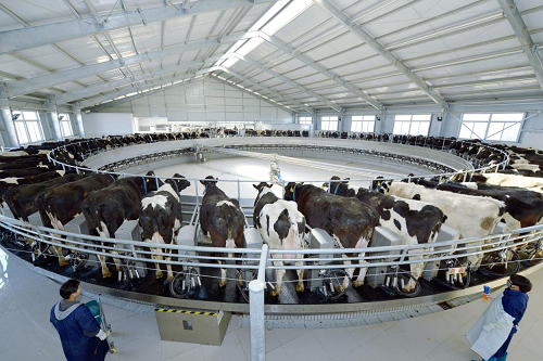 在平吉堡第六奶牛场挤奶车间,记者看到,奶牛排着队井然有序地进入转盘式挤奶台,每头牛对应一个挤奶位。验奶、消毒、上杯、挤奶、收杯、贮奶……整个过程仅用8分多钟。
