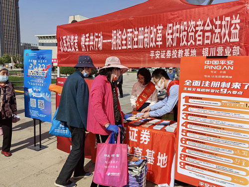 为切实做好投资者合法权益?;すぷ鳎中嵘蹲收呓鹑谒匮?,防范化解金融风险能力,帮助投资者熟悉全面实行股票发行注册制总体情况和主要制度安排、规则内容,助力投资者树立理性投资、价值投资、长期投资的理念,维护和谐、健康的金融消费环境,平安证券股份有限公司银川凤凰北街证券营业部(以下简称“营业部”)以“心系投资者,携手共行动——拥抱全面注册制改革,?;ね蹲收吆戏ㄈㄒ?rdquo;为主题,积极组织开展第五届“5·15”全国投资者?;ば疃?,持续深入做好全面注册制知识普及、规则讲解和风险揭示等工作。持续做好投资者预期引导,帮助投资者客观了解全面实行注册制带来的投资机会和投资风险。持续开展对注册制理念、股票退市风险的宣传教育,通过对全面实行注册制的积极意义、主要思路、相关举措等的宣传,深化投资者对注册制内涵的理解。同时,提示投资者市场波动风险,正确引导投资者敬畏市场、识别风险、根据自身风险承受能力选择适合的产品,进一步树立理性投资、价值投资、长期投资的理念。