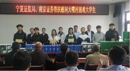 青年兴则国兴,青年强则国强。为深入学习贯彻党的二十大精神,认真贯彻落实习近平总书记关于青年工作的重要思想,宁夏证监局、南京证券于8月25日在大嘴村开展“先锋建新功,为民办实事”公益帮扶活动。南京证券宁夏分公司党委书记、总经理杨宁带领全区14位营业部支部书记冒雨来大嘴村,向20名困难大学生发放牛奶、食用油、面粉等共2万元慰问品。宁夏证监局纪委书记张霞、党办主任陈玲,宁夏证券期货基金业协会秘书长冒万成和树台乡政府相关领导出席捐助活动。