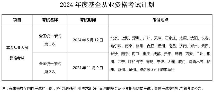 中国证券投资基金业协会现将2024年度考试计划公告如下: