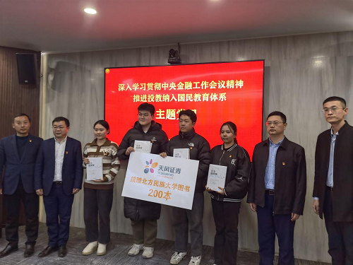 与会全体党员首先在李俊杰书记的领誓下重温了入党誓词。之后,宁夏证监局法律处处长、法律处党支部书记武胜利同志领学了中央金融工作会议精神,五名党员结合工作交流了学习心得体会,大家表示,中央金融工作会议鲜明提出“加快建设金融强国”的目标,为我国金融高质量发展指明了方向。无论金融监管部门、金融实务部门还是金融人才培养单位都要以习近平总书记重要讲话精神为指引,立足岗位,把学习成果转化为发展方向、思路和具体的工作举措,以更饱满的热情投入到金融强国的实践中。与会同志还针对如何进一步深化政校企合作,共同推动国民金融普惠教育、金融人才培养等进行了交流。天风证券银川黄河东路营业部向经济学院学子捐赠了200本《证券投资学》教材。