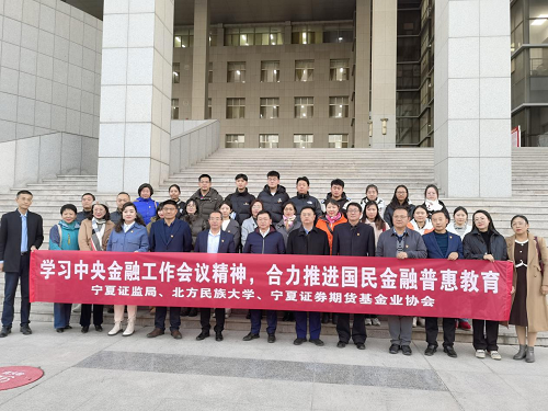 为进一步贯彻落实中央金融工作会议、促进政校企深度融合,提高人才培养质量,11月17日下午,宁夏证监局法律处党支部与北方民族大学经济学院教工党支部、宁夏证券期货基金业协会党支部联合开展了“深入学习贯彻中央金融工作会议精神推进投教纳入国民教育体系”主题党日活动,宁夏证监局党委委员、副局长宋征同志、北方民族大学党委书记、校长李俊杰同志,经济学院教工党员、学生党员40余人参加了此次主题党日活动。
