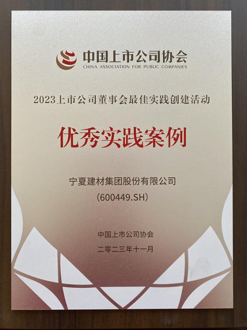 为进一步促进上市公司董事会合规有效运作,推动提高上市公司治理效能和发展质量,以及宣传、鼓励先进,积极发挥优秀公司示范引领作用,近日,中国上市公司协会启动2023上市公司董事会最佳实践创建评选活动,通过8项基础指标、39个维度,全面考察上市公司董事会运作水平。宁夏建材在本次评选中荣获“2023上市公司董事会优秀实践案例”奖。
