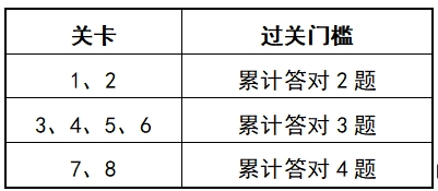 (3)当用户答对的题目数≥过关门槛则闯关成功,获得相应权益值并计入权益值排行榜。如用户挑战关卡失败,则该关权益值清零,失败关卡支持重复挑战。过关门槛具体如下: