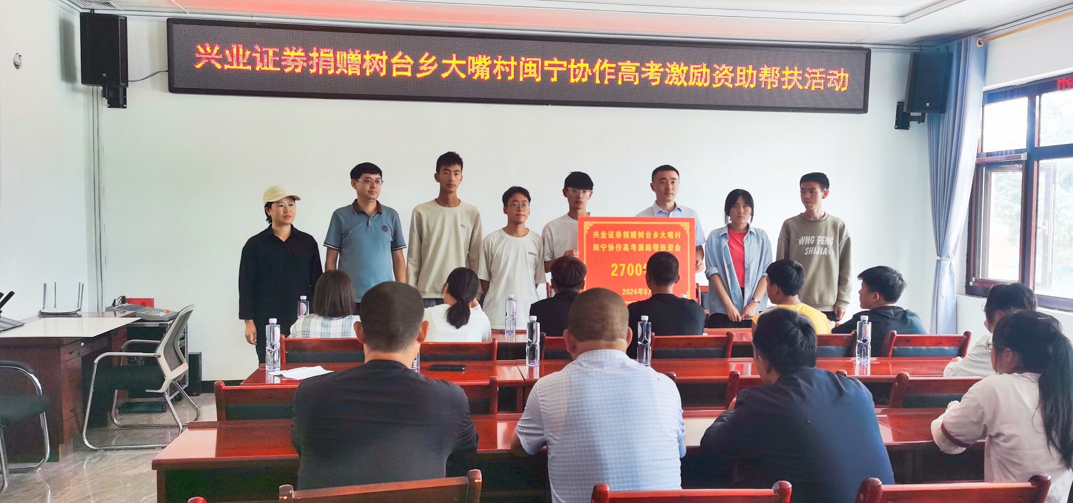 在监管部门和当地政府的倡议下,兴业证券宁夏分公司协调兴证慈善为海原县树台乡大嘴村2024年普通高等院校录取的全日制本专科新生27人每人提供1000元闽宁协作高考激励帮扶资金,激励更多乡村孩子努力学习,以教育帮扶阻断贫困代际传递,持续提升群众的安全感、幸福感、获得感持续提升,为新时代新征程闽宁协作事业贡献力量。