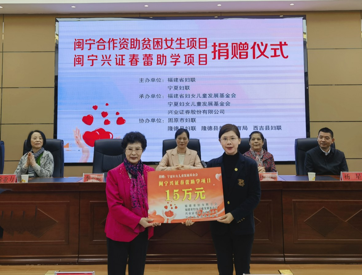 2023年起,兴业证券集团每年投入15万元资助兴证春蕾圆梦教育帮扶行动,在宁夏隆德县、西吉县、海原县,将帮扶对象由家境困难、考上大学的高中应届女毕业生拓展到家境困难的高中女生,每年为100名新入学的宁夏籍家庭困难、品学兼优的高一女生按照每人1500元的标准提供助学金,支持她们更好完成学业、逐梦未来,持续推动发展妇女儿童事业和教育事业高质量发展。