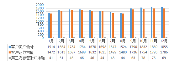 截至2024年12月末,客户资产合计1854.54亿元,同比增幅8.34%;其中客户证券市值(包括A股、B股、北交所股票、公募基金、债券及其他证券等)1785.51亿元,同比增幅7.02%;第三方存管账户余额69.03亿元,同比增幅59.2%。