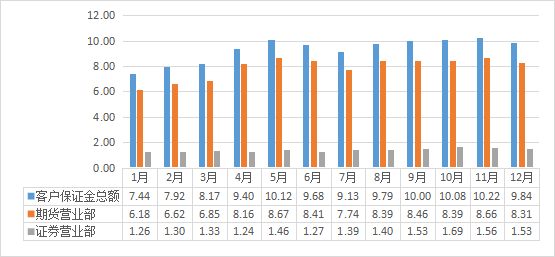 截至2024年12月末,宁夏期货客户保证金余额9.84亿元,同比增幅27.46%:其中,期货经营机构客户保证金余额8.31亿元,同比增幅30.46%;证券经营机构客户保证金余额1.53亿元,同比增幅12.5%。