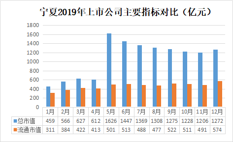 截至2019年底,宁夏共有上市公司14家,其中沪市6家,深市8家。总股本202.31亿股,流通股本118.43亿股,总市值1,272.32亿元,同比增幅172.91%;流通市值573.89亿元,同比增幅79.27%。