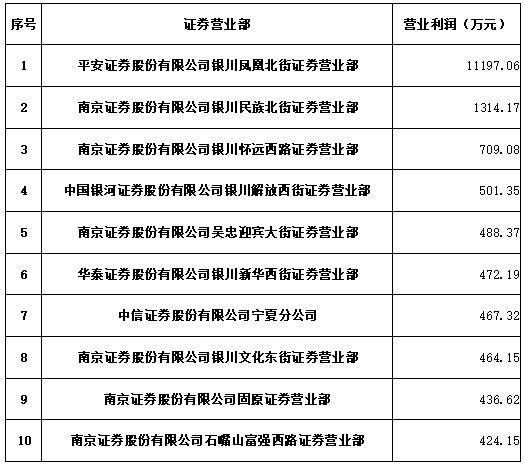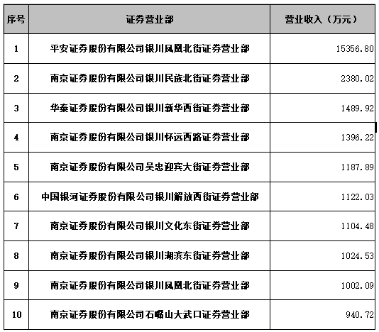 截至2019年底,宁夏共有15家分公司、44家证券营业部。其中,南京证券所属1家分公司,15家证券营业部、银河证券所属1家分公司,4家营业部长江证券所属1家分公司,2家营业部西部证券所属1家分公司,1家营业部国信证券所属1家分公司,1家营业部、申万宏源所属1家分公司,1家营业部、西南证券所属1家分公司,1家营业部中泰证券所属1家分公司、世纪证券所属1家分公司九州证券所属1家分公司、中信证券所属1家分公司、长城国瑞证券1家分公司、开源证券所属1家分公司、兴业证券所属1家分公司、华福证券所属1家分公司、华泰证券、平安证券、国泰君安、中信建投、招商证券、国盛证券、海通证券、华龙证券、广发证券、华林证券、东方证券、中国中金财富、天风证券、光大证券、广州证券、安信证券、太平洋证券、银泰证券和西藏东方财富各1家营业部。宁夏证券从业人员共计705人。