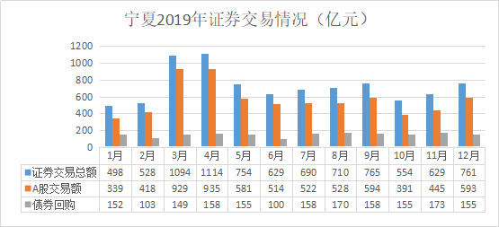2019年,宁夏证券交易总额(包括A股、B股、基金、债券及其他证券)8726.82亿元,同比增幅42.46%;其中A股交易额6788.64亿元,同比增幅87.72%;债券回购1786.17亿元,同比降幅26.42%。