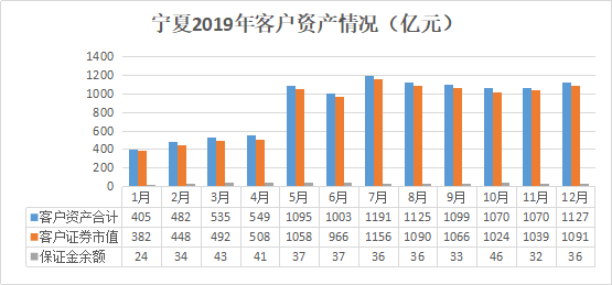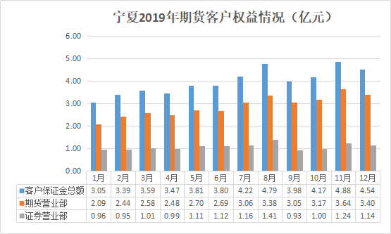 2019年底,宁夏期货客户保证金余额4.54亿元,同比增幅38.84%;其中,期货营业部客户保证金余额3.40亿元,同比增幅51.79%;证券营业部客户保证金余额1.14亿元,同比增幅10.68%。
