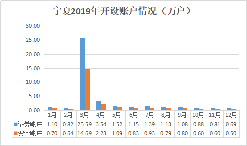 2019年,宁夏开设证券账户39.70万户,开设资金账户24.40万户。